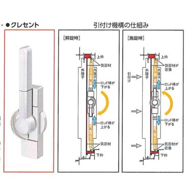 防音工事では防音サッシを取付けます。防音サッシはクレセントが付いています。てこの原理を利用し、窓をしっかり押し込んでクレセントでロックをかけるため、音の侵入原因の隙間を埋めて気密性を高めて防音します。