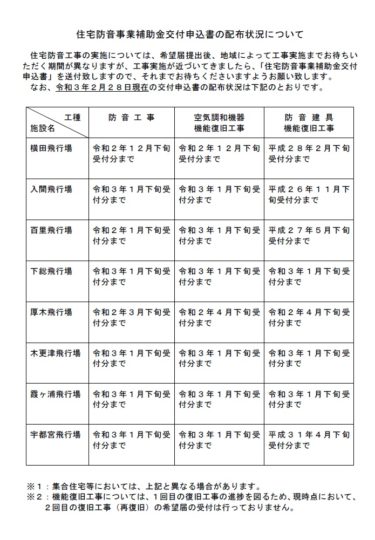 北関東防衛局のホームページにて、今年の防音工事の申込書の配布対象者の発表がありました。 「住宅防音事業補助金交付申込書の配布状況について(令和3年2月28日)」