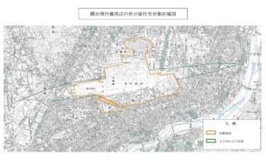下の地図の緑のラインで囲まれた地域(騒音レベル85W~)の住宅について、建築年月日の条件が「平成17年10月20日以前」に大幅に拡大され、その希望届の受付が7/12から開始されることになりました。