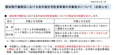 北関東防衛局のホームページにて、横田飛行場の防音工事の希望届の受付対象者が拡大される旨の発表がありました。 「横田飛行場周辺における告示後住宅防音事業の対象拡大について(令和3年4月1日)」