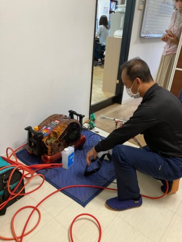 いよいよ塗布開始です!機械のモーターの大きな音に少々ビックリ。特殊なガンでとっても細かな二酸化チタンの粒子を作って塗布していきます。無害でどこにでも塗布出来ます。二酸化チタンは光と反応して細菌、ウイルスを分解!!